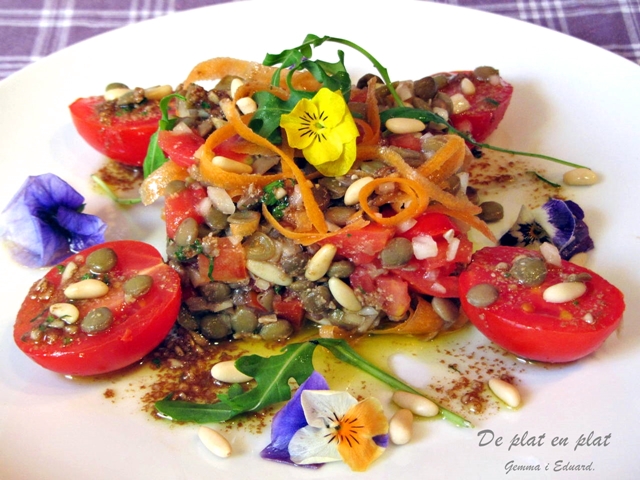 Un cop cuites les llenties, les deixem refredar i mentrestant farem una picadeta amb tots els altres ingredients. Amanim amb sal i un raig d’oli aquesta picadeta i la barregem amb les llenties.