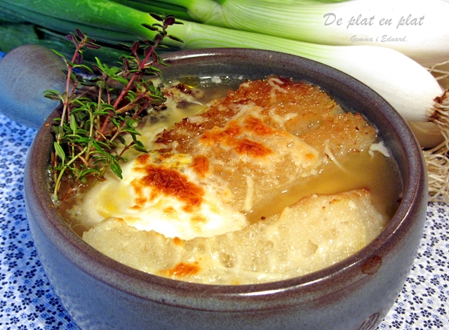 Posem la sopa a les cassoles, a sobre les llesques de pa torrat, l’ou (opcional) i finalment el formatge. ratllat.
